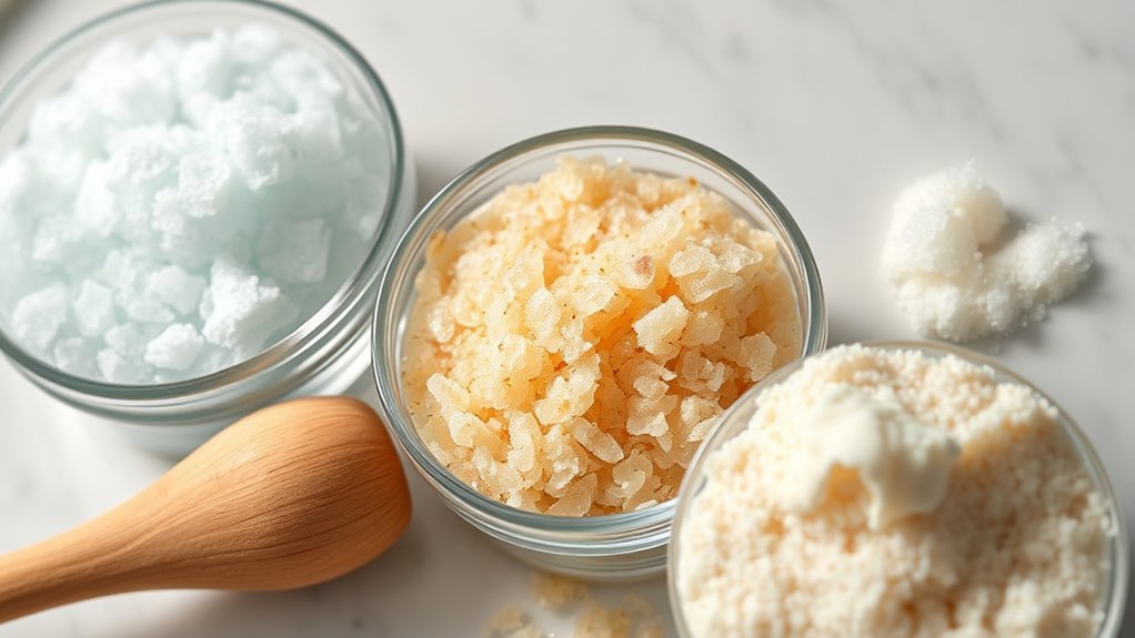 Salt scrubs are known for their coarse texture, making them excellent for exfoliating rough areas like elbows, knees, and feet. The natural minerals in salt, such as magnesium and calcium, can also help soothe sore muscles and improve circulation. To use a salt scrub, you simply massage it onto damp skin in circular motions, being careful not to apply too much pressure. Doing this once or twice a week helps slough off dead skin cells without irritating your skin. When making your own natural ingredients scrub, opt for sea salt or Himalayan salt, which contain beneficial minerals and are less processed than table salt. These natural ingredients enhance the exfoliation process while nourishing your skin. Incorporating mineral-rich salts can also support overall skin health and resilience, especially in conjunction with AI-driven skincare innovations.