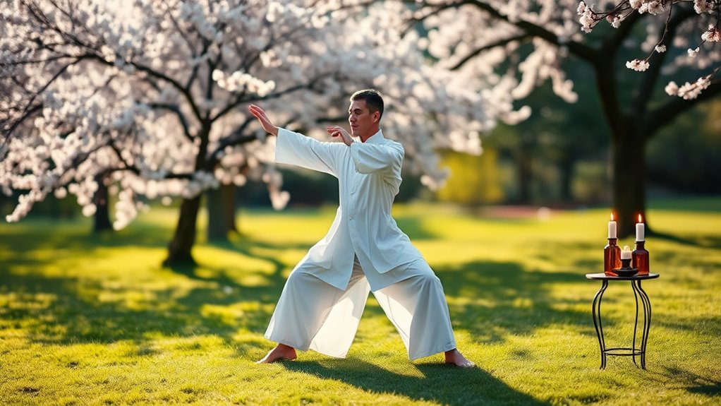 In essence, combining Tai Chi with aromatherapy transforms your practice into a holistic experience. It’s not just about the physical movements but about cultivating a mindful state that promotes mental clarity, emotional stability, and overall well-being. By consciously choosing herbal scents that resonate with your needs, you deepen your connection to each moment, making your Tai Chi practice a truly restorative ritual. Incorporating essential oils can further enhance your ability to focus and relax during your routine.