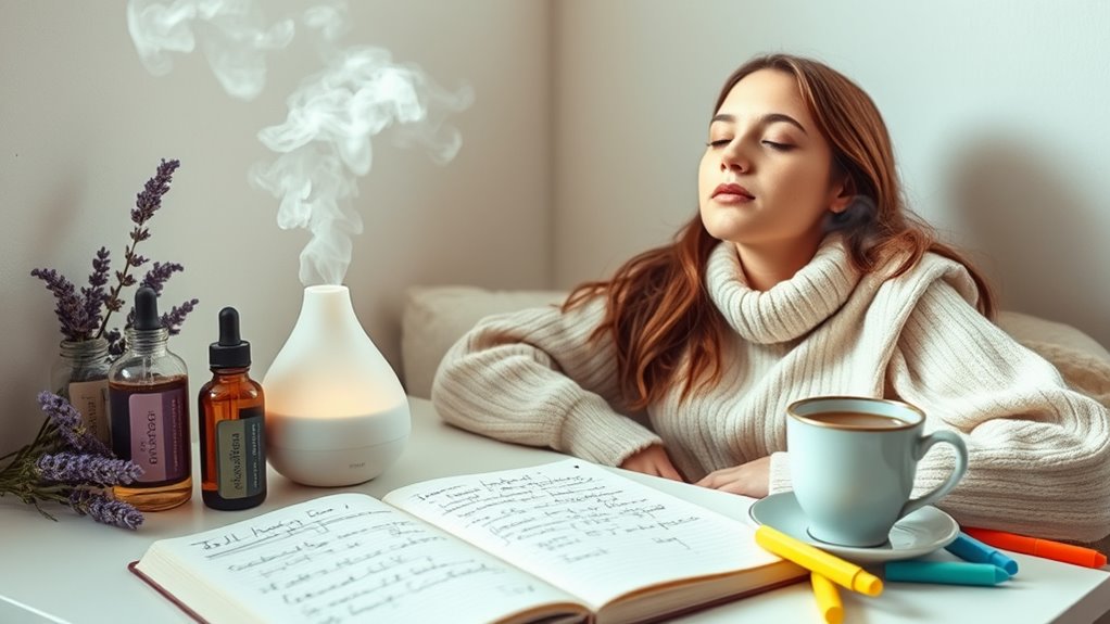 To stay calm during exams, try using aromatherapy with calming scents like lavender or chamomile. Diffusing these oils can help relax your mind, reduce anxiety, and improve sleep quality, which boosts focus and memory. Combine aromatherapy with mindfulness breathing exercises for even greater stress relief. Keep a routine that includes calming scents before studying and sleeping. If you keep exploring, you’ll discover simple tips to maintain your cool and ace your exams.