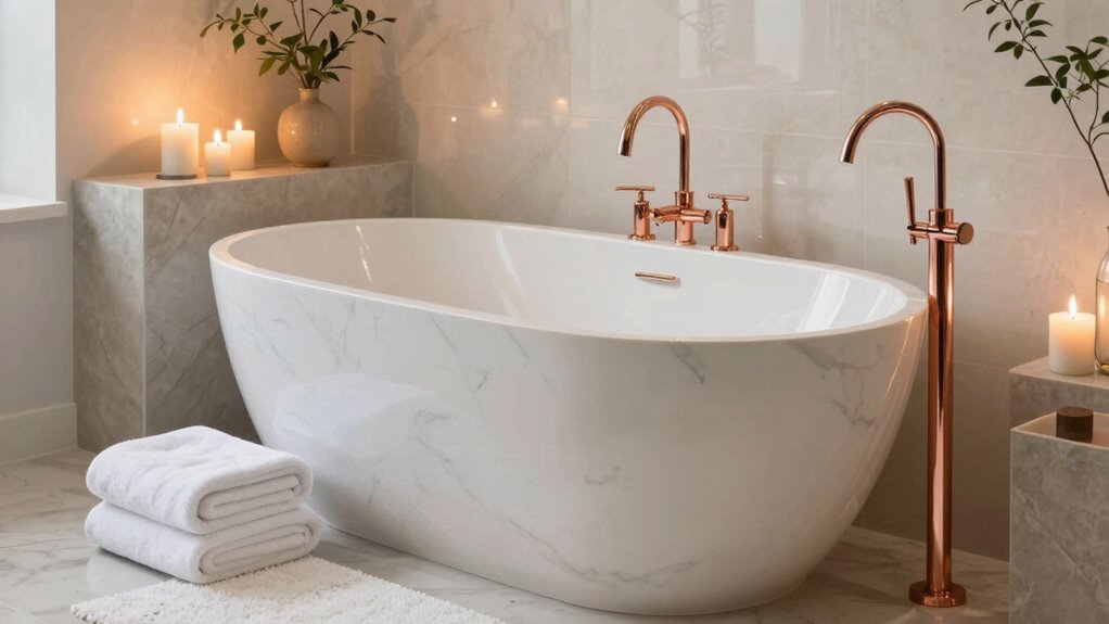 Budget-friendly accessories like candles and plants can considerably elevate your bathroom’s ambiance without breaking the bank. These simple touches add warmth and personality, transforming your space into a calming retreat. Choose candles in soothing scents and soft colors to create a cozy atmosphere. Small potted plants, like succulents or ferns, bring a touch of nature indoors, boosting the feeling of serenity. Incorporating landscaping elements can further enhance the natural vibe and make the space feel more integrated with nature. Adding proper placement of these accessories ensures they complement the overall design and are easily accessible. These budget-friendly accessories are easy to arrange and maintain, making them perfect for quick upgrades. By incorporating candles and plants, you enhance bathroom ambiance effortlessly and affordably. Incorporating craftsmanship fundamentals ensures that your decorative choices are both beautiful and thoughtfully selected, creating a more inviting, spa-like environment that feels both luxurious and personal, all without any significant expense or effort. Additionally, choosing accessories with durability and safety in mind helps maintain a relaxing atmosphere over time. Being mindful of proper maintenance can also prolong the lifespan of these accessories and keep your space looking fresh.