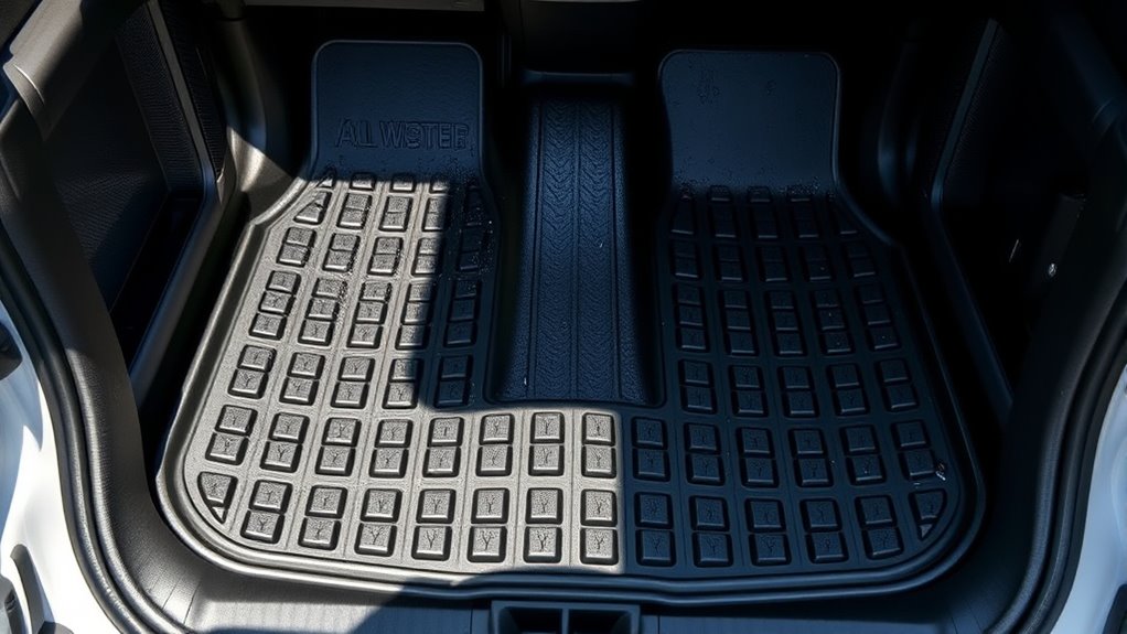 Think of all-weather mats as the sturdy roots of your vehicle’s comfort. In extreme temperatures, they perform remarkably well, resisting cracking in cold and warping in heat. I’ve found they adapt like a resilient tree, providing reliable protection regardless of the weather. Their durable rubber construction ensures they stay in place and keep your floors dry, making them a dependable shield in any climate.