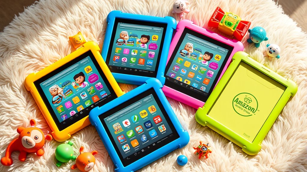If you’re looking for the best Amazon Fire tablets that mix fun with safety for your kids, I highly recommend considering options like the Fire HD 10 Kids Pro, Fire HD 8 Kids, and Fire 7 Kids tablets. These models come with durable, kid-proof cases, parental controls, and engaging content subscriptions. They’re designed for different ages, ensuring a great fit for your child’s needs. Keep exploring, and I’ll guide you through the top choices to make a smart decision.