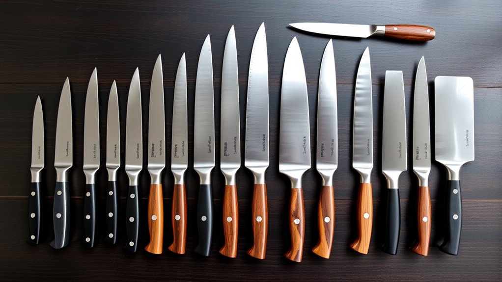 A versatile chef knife set is essential for tackling a wide range of culinary tasks efficiently. It should include various knife types like chef’s, paring, utility, and Santoku to handle different prep work seamlessly. The range of blade sizes, from 3 to 8 inches, offers precise control for both delicate and heavy-duty tasks. High-quality sets often feature forged blades with full tang construction, boosting durability and balance for diverse uses. Including specialized knives such as bread, carving, or fillet knives expands the set’s adaptability, making it suitable for any kitchen situation. Material choice, like high-carbon stainless steel or Damascus layers, enhances performance, edge retention, and longevity. A well-rounded set ensures I’m prepared for any culinary challenge that comes my way.