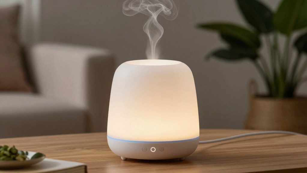 Cleaning these diffusers is a breeze, like a gentle breeze on a summer day. I find that regular wiping with a damp cloth keeps the exterior fresh, while descaling the reservoir every few weeks prevents buildup. Most models have removable parts, making it easy to clean thoroughly. Just avoid harsh chemicals, and you’ll keep your diffuser running smoothly, ensuring it delivers calming aromas without a hitch.