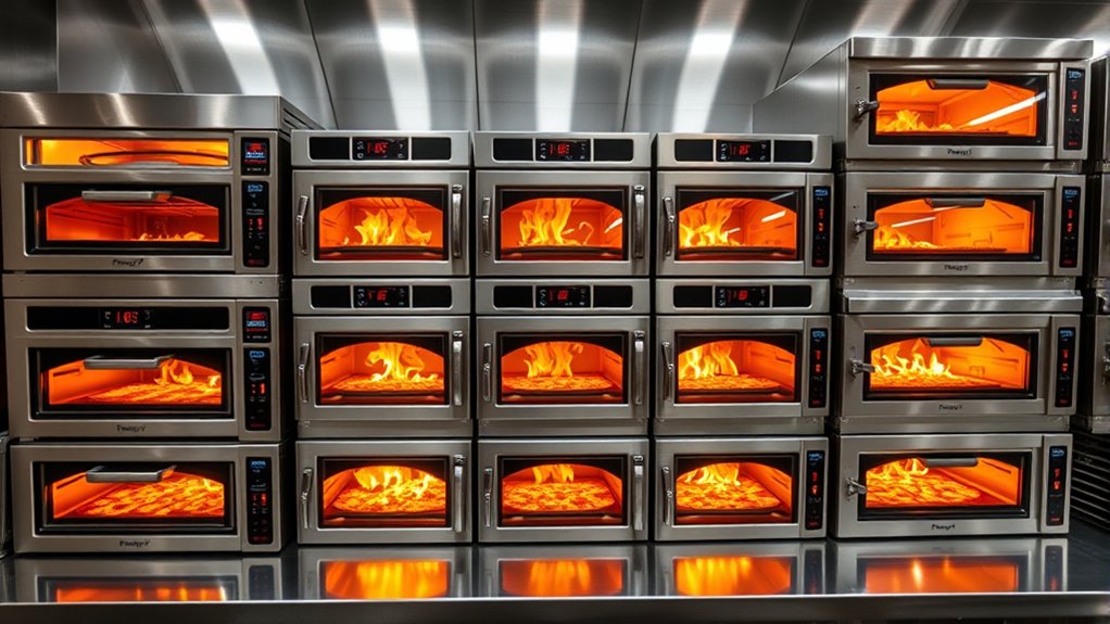 Rapid heating speed is essential when choosing a counter pizza oven capable of reaching at least 800°F, as it directly influences how quickly I can start baking and maximize my productivity. High-powered heating elements, typically 1200W or more, allow the oven to quickly attain and maintain ideal temperatures, reducing preheat times. This means I can go from turning the oven on to baking in just minutes, which is vital during busy periods. Advanced thermal designs, such as ceramic stones or dual heating tubes, help distribute heat evenly, enhancing speed and consistency. Faster heat-up times mean less energy wasted and more consistent, restaurant-quality results. Overall, an oven that heats efficiently helps me serve more pizzas faster without sacrificing quality.