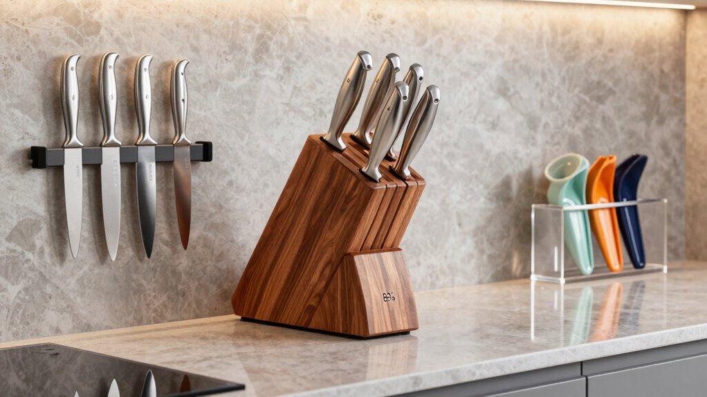 If you’re looking for the top countertop knife holders for 2026 that chefs recommend, I’ve found 15 standout models. They include magnetic racks, wooden blocks with lids, and versatile options with sharpeners and extra slots. These organizers are praised for safety, capacity, and sleek design. Whether you have a small or large collection, there’s a perfect fit for your kitchen. Keep going to discover detailed features and why these options are favorites among culinary pros.