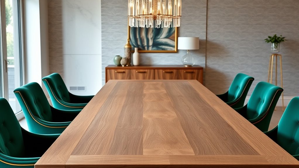 I recommend choosing materials like solid hardwoods such as oak, maple, or walnut for longevity. They’re incredibly durable and can withstand everyday wear and tear. Metal table frames are also a great option for long-term use because they’re sturdy and resistant to damage. I personally prefer surfaces like tempered glass or granite for their scratch resistance. These materials guarantee your table stays beautiful and functional for years to come.