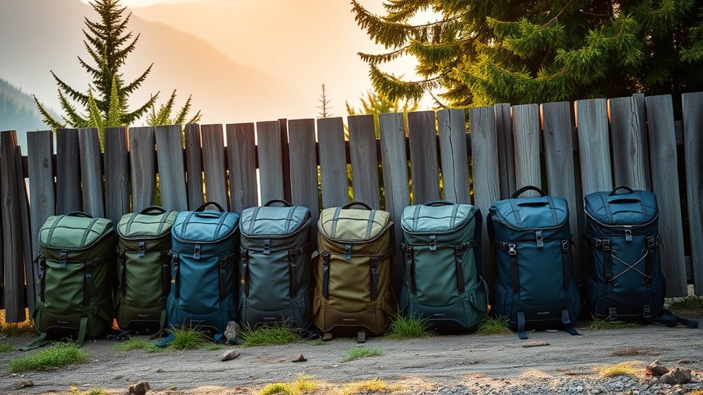 Choosing a durable travel backpack for hiking starts with evaluating its material strength and resistance. I look for high-denier nylon or polyester fabrics, which offer great tear and abrasion resistance, ensuring the backpack withstands rough terrain. Water-resistant or waterproof materials like rip-stop nylon with coatings or TPU lamination are essential to protect my gear from moisture and harsh weather. Reinforced stress points at zippers, seams, and handles help prevent tearing and prolong the bag’s life, especially during heavy use. Heavy-duty zippers with lockable sliders and weather-resistant coatings add extra durability. Additionally, a dense weave and reinforced patches or bar tacking at high-stress areas substantially boost resistance to wear and tear, making the backpack reliable for long-lasting adventures.