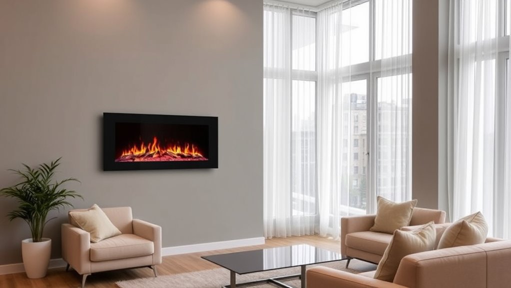 A 60-inch electric fireplace with remote control and touch screen offers an impressive combination of size and convenience, making it ideal for those seeking a realistic, customizable fireplace solution without venting. Its ultra-thin design, just 4.3 inches deep, fits seamlessly into walls for a sleek look. The large front glass surface displays vivid flame effects with four color options and adjustable brightness, creating a cozy ambiance. You can easily control settings via the touch screen or remote, adjusting heat, timers, and flame effects. With safety certifications and automatic shut-off, it’s a reliable choice that heats up to 400 sq ft, all while enhancing your apartment’s style.