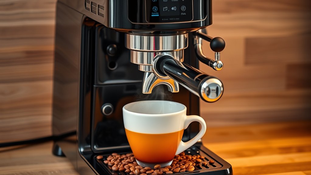 Having control over your brew customization options can make a significant difference in your coffee experience. When choosing an espresso machine, look for adjustable grind settings so you can fine-tune the coarseness for different brewing styles. Temperature and pressure controls are also essential—they let you optimize extraction for richer flavor. Programmable brew strength and volume settings enable you to customize each cup exactly to your preferences, whether you want a stronger shot or a lighter one. Machines with multiple brew modes, like espresso, lungo, or cold brew, offer greater versatility to experiment with different coffee styles. Additionally, manual override options for grind size and shot timing give you the flexibility to perfect your brew on the fly. These features ensure you get a personalized coffee experience every time.