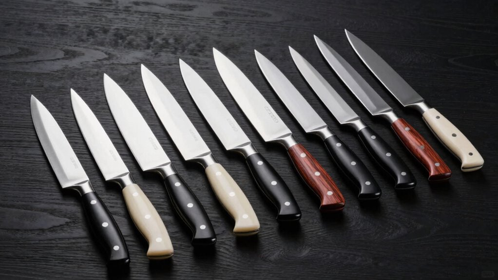 Choosing the right blade material is essential because it directly affects a knife’s sharpness, durability, and ease of maintenance. High-end chef knives often use premium steel alloys like VG10, VG-MAX, or Japanese high-carbon steels such as 10Cr15CoMoV, which offer excellent hardness and edge retention. Layered Damascus steel, with 67 or more layers, not only boosts durability and corrosion resistance but also creates stunning patterns. The steel’s hardness, typically between 58 and 62 HRC, strikes a balance between sharpness and toughness, preventing chipping and dulling. Proper heat treatments like ice tempering or vacuum cold nitrogen processes further enhance resilience and corrosion resistance. High-chromium content, around 15-20%, helps keep the blade rust-free and easier to maintain, ensuring longevity and performance.