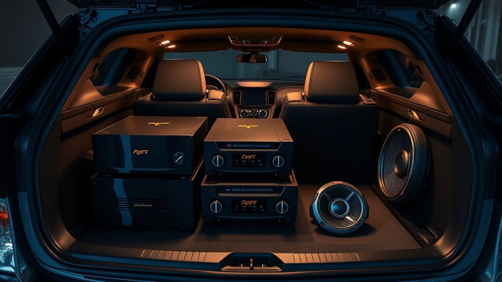 Installing a high-end car audio system involves more than just selecting quality components; guaranteeing they stay reliable over time is equally important. High-end systems are built with durable materials like corrosion-resistant connectors and sturdy chassis, designed to withstand harsh conditions. Choosing reliable components, such as premium amplifiers, speakers, and wiring, reduces the risk of failure and maintains consistent sound quality. Proper professional installation is essential to prevent hardware damage, loose connections, or electrical issues that can compromise durability. Advanced cooling features like heat sinks and ventilation help prevent overheating, extending the lifespan of critical parts. Regular maintenance and using high-grade, compatible accessories further guarantee long-term reliability, keeping your audio system performing flawlessly for years to come.