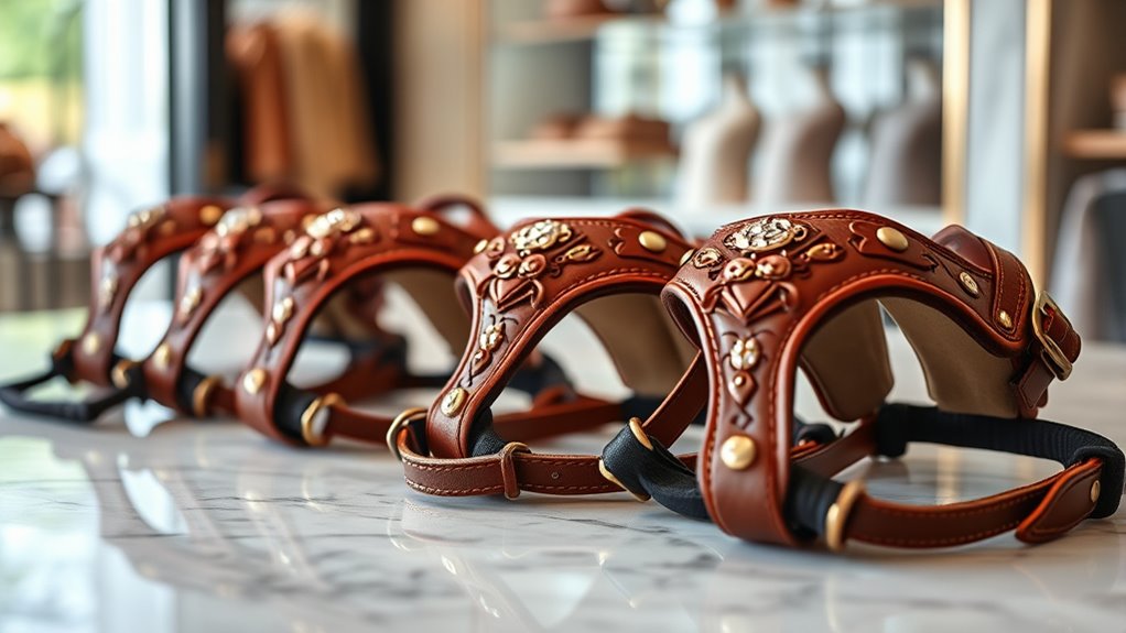 Luxury harnesses often offer superior safety features because they focus on fine craftsmanship, durable materials, and innovative design. I’ve found that premium harnesses include reinforced straps, padded support, and secure fastenings that prevent escapes and distribute pressure evenly. So, not only do they boost style and comfort, but they also provide peace of mind during walks. Investing in a luxury harness means prioritizing your pup’s safety without sacrificing style.