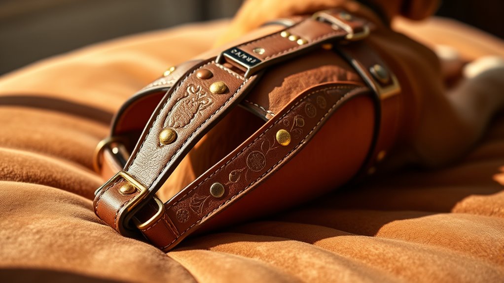 Luxury harnesses differ from standard options mainly in the quality of materials and craftsmanship. I’ve found they use softer, more durable fabrics like premium leather or plush nylon, with finer hardware for added strength. They’re designed not just for function but to look stylish and feel comfortable for your dog. Plus, they often feature adjustable, padded straps that offer a snug, custom fit, making them a better choice for both comfort and elegance.