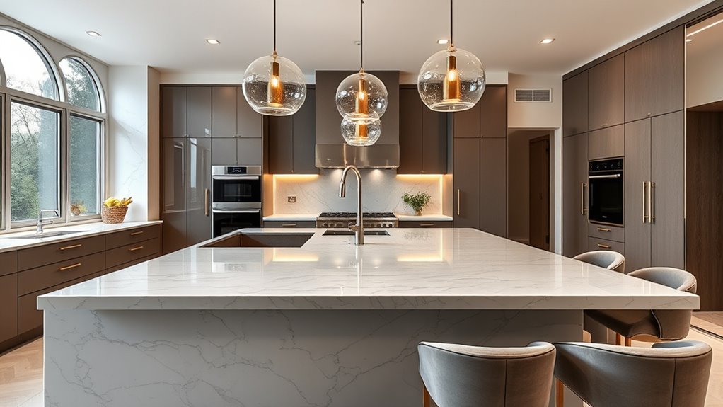 I recommend materials like quartz, granite, and marble for durability in luxury kitchen islands. Quartz is especially tough and resistant to stains, making it ideal for everyday use. Granite offers natural beauty and strength, while high-quality marble adds elegance but needs proper sealing to prevent damage. I always choose these materials because they balance luxury and resilience, ensuring your island stays beautiful and functional for years to come.