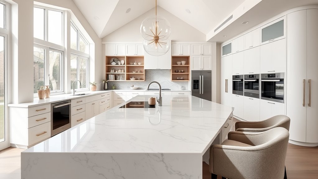 Imagine a sleek, modern sculpture in your kitchen—2025’s design trends for luxury islands mirror that artful elegance. I see bold materials like matte black finishes and mixed metals, combined with smart tech integrated seamlessly. Open shelving and multi-functional surfaces create a dynamic centerpiece. These trends transform your kitchen into a masterpiece, blending form and function effortlessly, making your cooking space both stunning and highly practical.