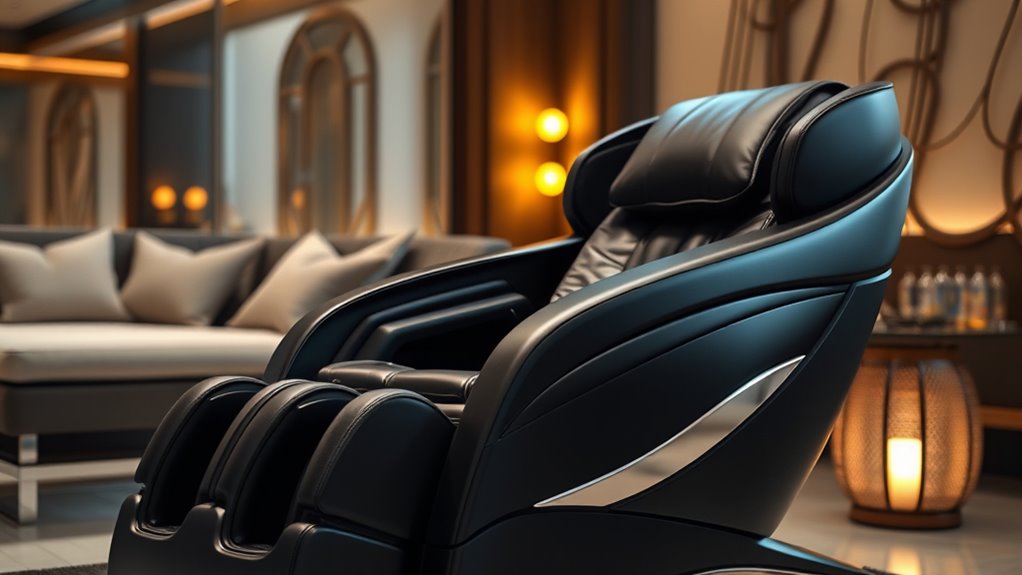 When evaluating massage chairs, I pay close attention to their design and comfort features, since these directly impact how relaxing and effective the experience feels. Ergonomic designs that contour to the body are essential, as they provide ideal support and reduce pressure points. Adjustable features like recline angles, zero gravity positions, and customizable padding let me tailor the chair to my preferences, enhancing comfort. High-end models often include multiple massage zones and techniques, targeting specific muscle groups for a personalized experience. The materials matter too—using high-quality, breathable, and skin-friendly fabrics ensures durability and comfort during long sessions. Extras like heated surfaces, ambient lighting, and entertainment options create a more immersive environment, elevating the overall relaxation experience.