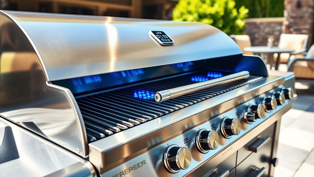 High-end outdoor grills stand out not just for their durable materials but also for their advanced heating technology, which markedly enhances cooking performance. Infrared burners can reach up to 1500°F, enabling quick, high-precision searing that locks in flavor. Many models feature multiple heat zones with independent controls, allowing me to cook different foods at various temperatures simultaneously, boosting versatility. Ceramic or quartz heat plates improve heat distribution and retention, eliminating hot spots and ensuring even cooking. Some grills incorporate electronic ignition systems with sensors, ensuring quick, reliable startups and flame stability. Modern grills also include digital thermostats and smart temperature monitoring, giving me precise control and real-time feedback. These features collectively elevate grilling, making high-end models a worthwhile investment for the ultimate outdoor cooking experience.