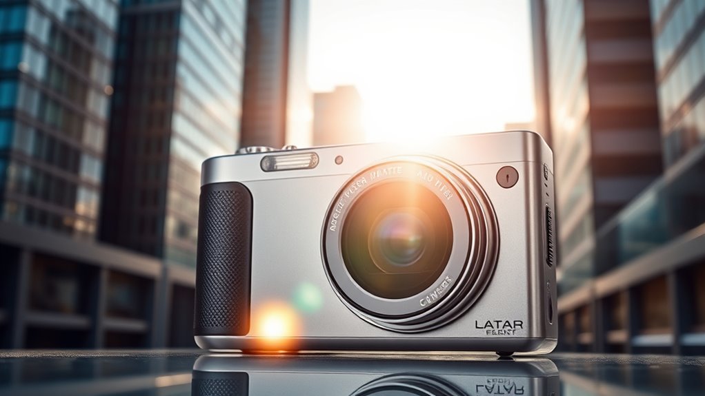 Choosing a high-end point-and-shoot camera means paying close attention to image quality and resolution. These cameras often feature sensors with 16MP to 80MP, guaranteeing sharp, detailed images perfect for large prints or cropping. Sensor size is vital—larger sensors capture more light, resulting in better color accuracy and less noise, especially in low-light conditions. Optical image stabilization helps keep photos sharp at high zoom levels or in challenging lighting. Many advanced models support RAW image capture, giving you greater flexibility in editing for professional results. Additionally, multi-coated lenses and sophisticated processing algorithms enhance clarity, reduce aberrations, and produce vibrant, true-to-life colors. All these factors work together to guarantee your photos are stunning, detailed, and of the highest quality.