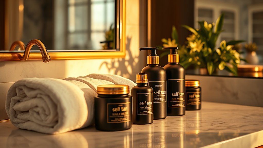 If you’re after the best high-end self-tan products for a flawless, natural glow, I’ve got you covered. From long-lasting mousses like b.tan Ultra and quick-developing foams like St. Moriz, to professional tools such as various self-tanning brushes and gloves, there are options for every skin type and application style. Plus, products like Tan Me BB Cream and water mists add a nourishing touch. Keep going, and you’ll discover more top picks to get that perfect tan effortlessly.