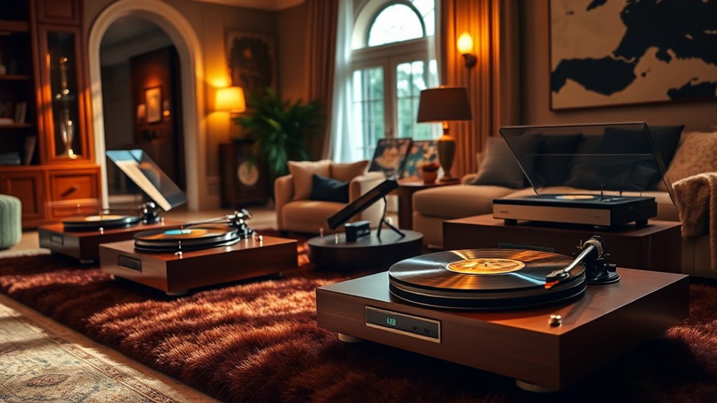 Choosing a high-end vinyl record player is vital if you want to experience superior sound quality. These players are crafted to deliver exceptional clarity, depth, and fidelity, allowing for detailed audio reproduction. The components—like the tonearm, cartridge, and platter—are essential; they directly impact sound accuracy and minimize distortion. Many high-end models come equipped with advanced anti-vibration technologies and precise speed controls, ensuring consistent playback quality. This proper sound quality not only enhances your listening experience but also captures subtle nuances and dynamic ranges that lower-quality players simply can’t match. Investing in a high-fidelity system preserves sound integrity over time, so you won’t have to worry about degradation that often comes with cheaper alternatives.