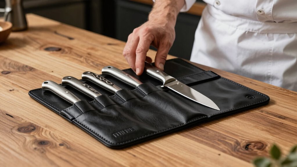 Choosing the right knife roll can feel overwhelming, but remember, it’s about what works best for your style and needs. I get it—investing in quality gear might seem costly upfront, but a durable, well-designed roll protects your tools and saves you money in the long run. Picture confidently steering busy kitchens, knowing your knives are secure and organized. Trust me, a great knife roll is a game-changer for every chef’s workflow.