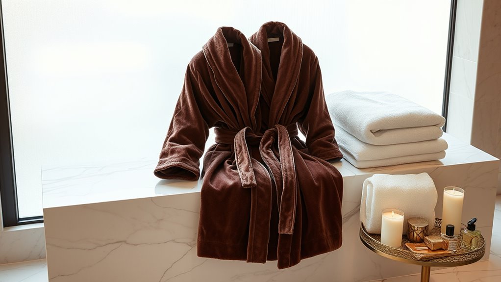 If you’re looking to elevate your spa experience, I recommend exploring luxurious bathrobe and towel sets made from high-quality fabrics like Turkish or Egyptian cotton, or plush microfiber. These sets often feature elegant designs, soft textures, and superior absorbency to turn everyday routines into indulgent moments. From plush robes with adjustable belts to ultra-absorbent towels, there’s a perfect option for everyone. Keep going, and I’ll help you find the best picks to transform your bathroom into a spa sanctuary.