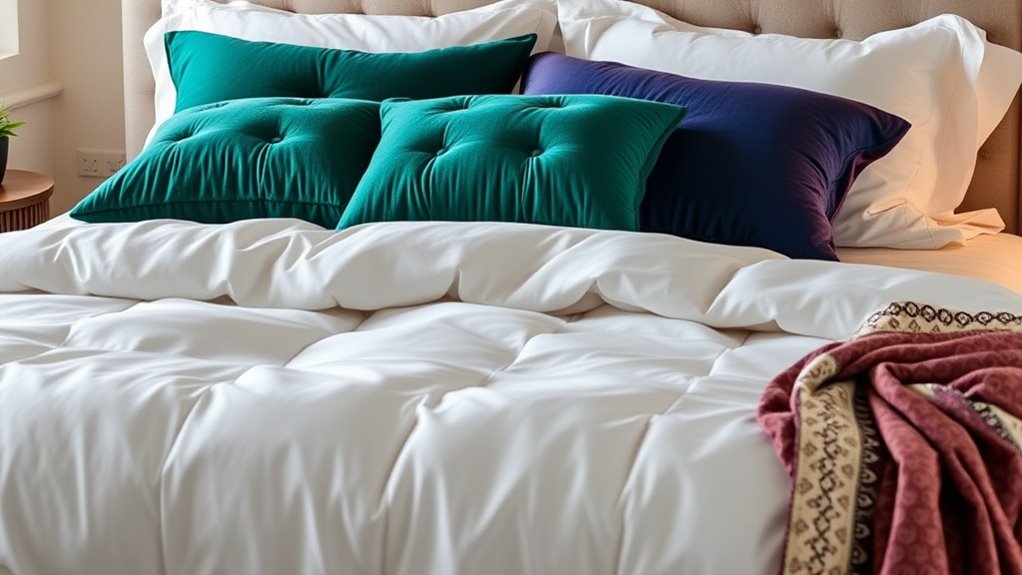 Ever wondered how luxury bedding can improve your sleep quality? It all comes down to breathability and temperature regulation. Breathable materials like bamboo viscose and microfiber allow air to circulate, helping to keep you cool and comfortable all night. Natural fibers such as Egyptian cotton and long-staple cotton excel at moisture-wicking, reducing sweat buildup and preventing overheating. Thermoregulating fabrics adapt to environmental changes, keeping you warm in winter and cool in summer. Using deep-pocket fitted sheets with elastic edges guarantees a snug fit, preventing bunching that traps heat. Lightweight, moisture-wicking sheets and toppers promote better ventilation and quick evaporation of sweat, maintaining a dry, cool sleep environment. These features work together to optimize your comfort and support restorative sleep.