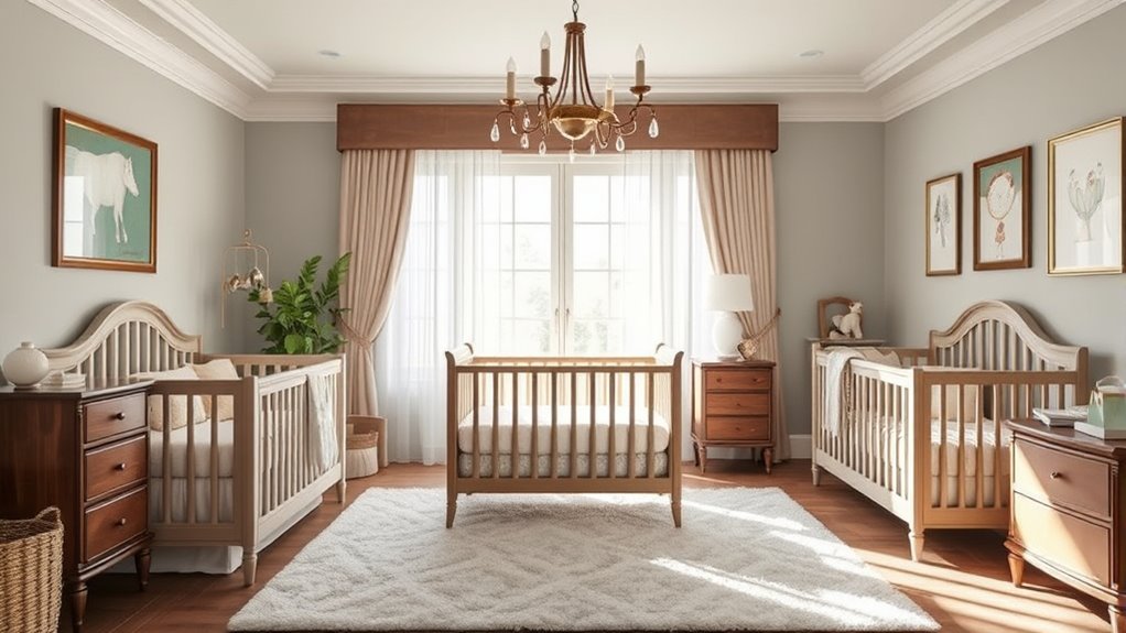 Luxury convertible cribs often use high-quality materials like solid hardwood, which guarantees durability and a timeless look. I’ve noticed that many cribs also incorporate non-toxic finishes to keep the nursery safe. Some even feature upholstered elements with soft fabrics for added comfort. Additionally, metal accents can enhance the design and functionality. When I chose mine, I made sure to take into account how these materials would blend style and safety in my nursery.