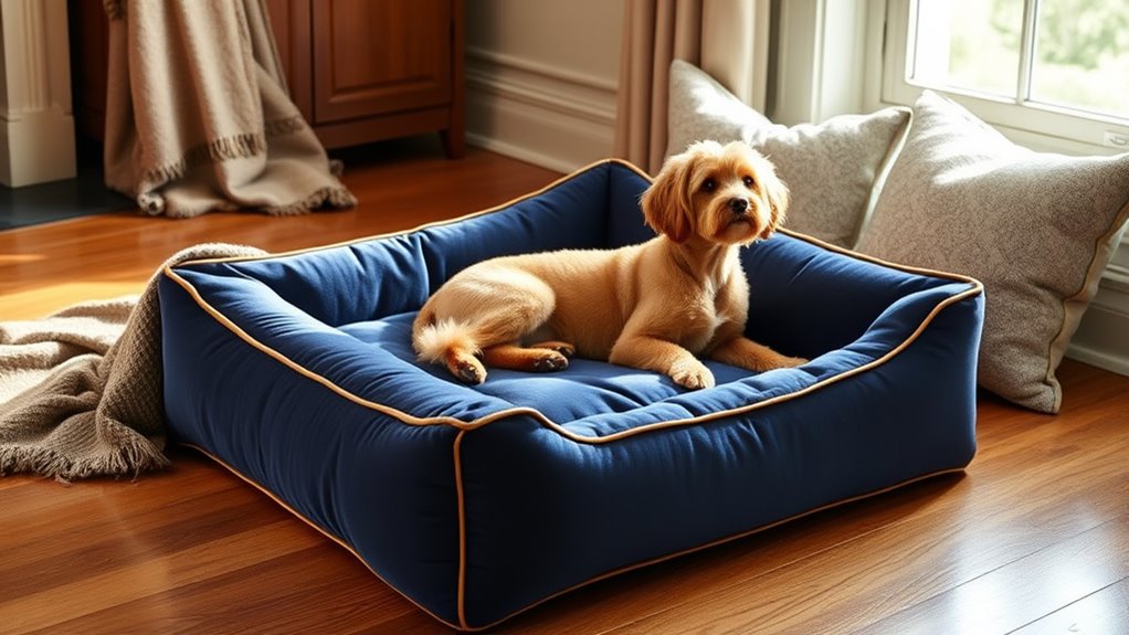 They say, “A good bed is the foundation of good health,” and that’s true for dogs too. Luxury beds support different sleep styles by offering adjustable cushioning, supportive bolsters, and memory foam layers that cradle your pup’s unique position. I’ve noticed my dog prefers a cozy corner, so a bed with raised edges helps him feel secure. It’s all about matching the bed’s design to your dog’s comfort needs.