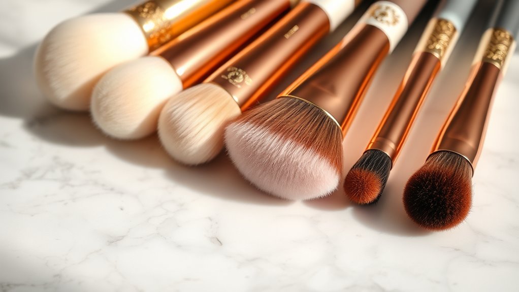 Ever wonder why luxury brushes make such a difference? They improve makeup application by offering superior craftsmanship, allowing for smoother, more precise blending and coverage. The high-quality bristles pick up and distribute product evenly, reducing waste and streaks. Plus, their ergonomic handles provide better control, making your routine more comfortable. Honestly, these brushes help you achieve professional-looking results effortlessly—who wouldn’t want that kind of upgrade?