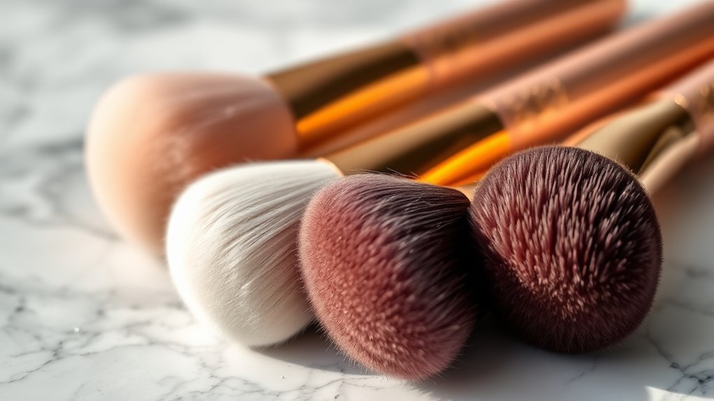 I find that synthetic bristles are better for sensitive skin because they’re gentle, hypoallergenic, and less likely to cause irritation. They also pick up and distribute product smoothly, giving a flawless finish. Natural bristles can sometimes be too harsh or cause allergic reactions for sensitive skin types. So, if you have delicate skin, I recommend choosing high-quality synthetic brushes for a comfortable, irritation-free makeup application.