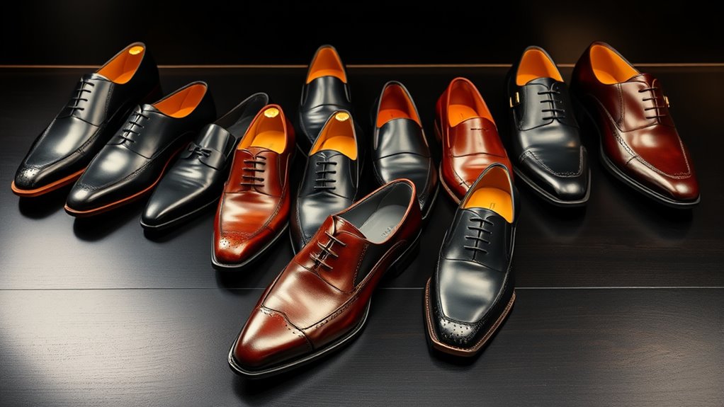 Have you ever wondered why some luxury men’s dress shoes command higher prices? The answer often lies in the materials used, like genuine leather and high-quality soles, which justify the premium cost. Craftsmanship also plays a key role; hand-stitched details and meticulous finishing add to both the price and the shoe’s value. Investing in well-made luxury shoes means you’ll enjoy better durability and longer wear, providing more value over time. Additionally, higher prices can reflect a brand’s heritage, exclusivity, or limited editions, enhancing their perceived worth. Ultimately, balancing cost with features like comfort, support, and style ensures you get true value for your investment. Choosing wisely means considering both the craftsmanship and the lasting quality behind the price.