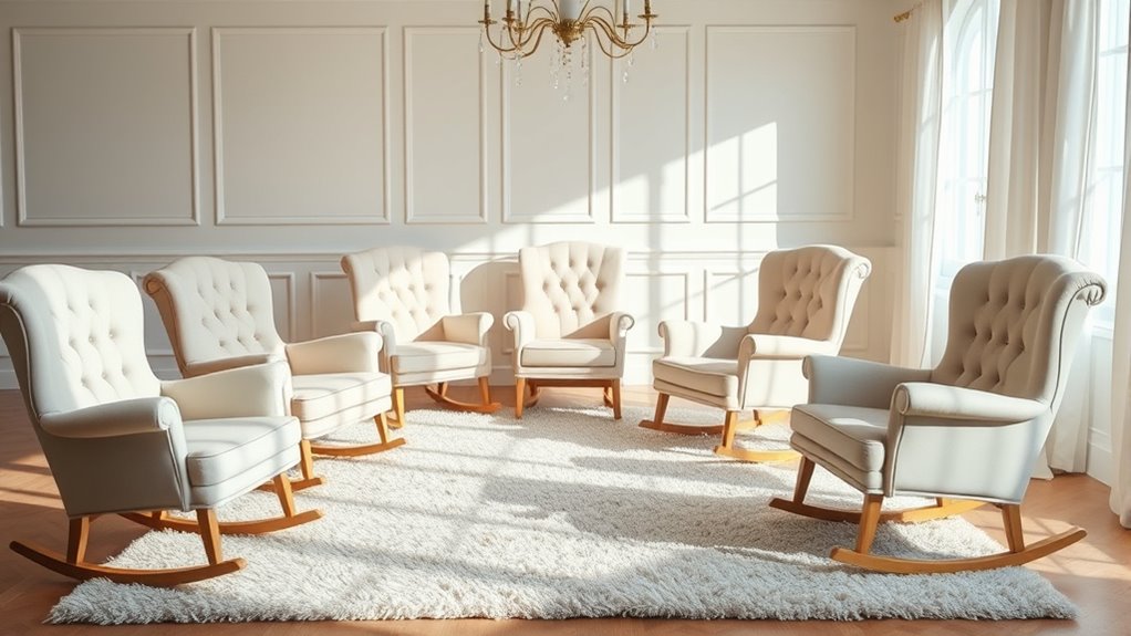 Luxury nursery rocking chairs often use high-quality materials like solid wood for durability and stability. You’ll find plush upholstery made from soft fabrics, like velvet or linen, that add a touch of elegance. Many chairs also feature high-density foam cushions for comfort. Additionally, some incorporate natural fibers or eco-friendly materials, ensuring safety for your little one. When selecting a chair, I always consider the balance between style, comfort, and sustainability.