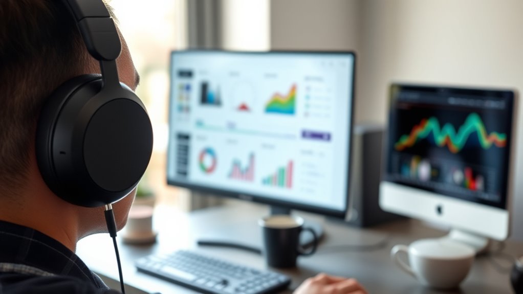 When selecting noise-canceling headphones for remote work, paying attention to microphone quality is just as important as connectivity. A high-quality microphone with noise-canceling tech can block up to 99% of background noise, ensuring clear communication even in noisy environments. Microphone sensitivity and frequency response, usually between 100Hz and 10kHz, influence how natural and intelligible your voice sounds. Features like 270° rotatable or flip-to-mute microphones provide flexibility for positioning and quick privacy control. Active noise-canceling microphones minimize ambient sounds, making calls clearer whether you’re in a busy café or noisy office. Clear microphone transmission is crucial for professional interactions, helping colleagues and clients hear you accurately and improving overall remote work productivity.