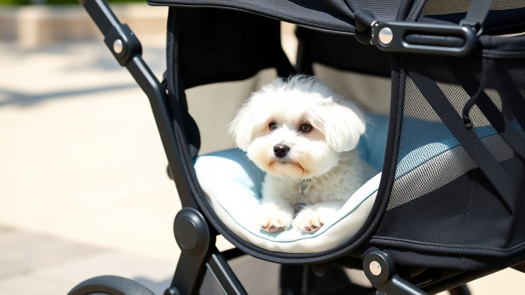 Ensuring my small dog stays safe during outings is a top priority, so I look for stroller features that keep my pet secure. I check for secure harnesses or safety straps inside the stroller to prevent accidental falls. Reliable brakes on the wheels are essential, especially on inclines, to prevent unintended movement. I also verify that zippers, mesh doors, or closures are sturdy and can securely enclose my pet, reducing escape risks. A reinforced frame and stable base help minimize wobbling or tipping, providing extra safety. Additionally, I ensure the ventilation openings are mesh-covered and securely fastened, allowing airflow while preventing my dog from poking out or escaping. These features give me peace of mind during every walk.