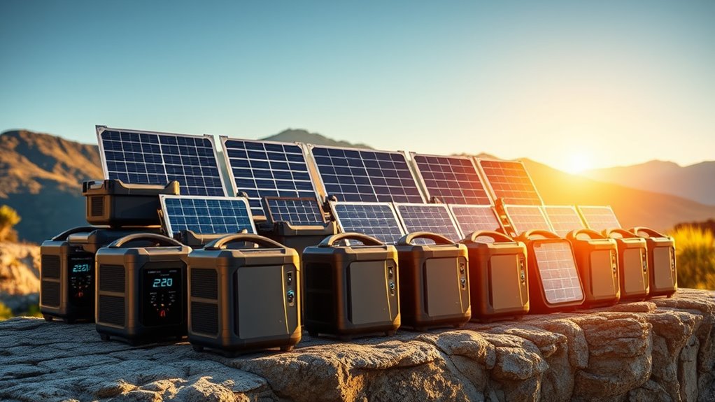 I’ve found the 15 best portable solar generator kits for power on the go in 2025, ranging from lightweight units with 146Wh batteries to powerful models like the OUPES 2000W kit with a 240W solar panel. These systems are perfect for camping, emergencies, or off-grid use, offering versatile outlets and fast recharge options. Keep exploring, and you’ll discover detailed insights to help you pick the perfect setup for your needs.