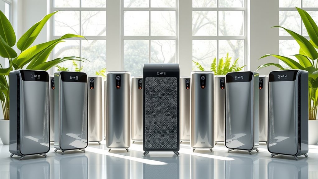 Smart connectivity features markedly enhance the convenience and functionality of premium air purifiers with HEPA filters. With these, I can control and monitor my device remotely through a smartphone app, receiving real-time air quality updates and managing settings effortlessly. Many models support voice commands via virtual assistants like Alexa, Google Assistant, or Siri, making it even easier to adjust the purifier hands-free. Wi-Fi or Bluetooth connectivity allows scheduling, changing fan speeds, and activating specialized modes at my convenience. Additionally, advanced features often include filter replacement alerts and maintenance reminders, ensuring ideal performance without manual checks. Smartphone notifications alert me to air quality changes instantly, enabling me to take immediate action and maintain a healthier indoor environment effortlessly.