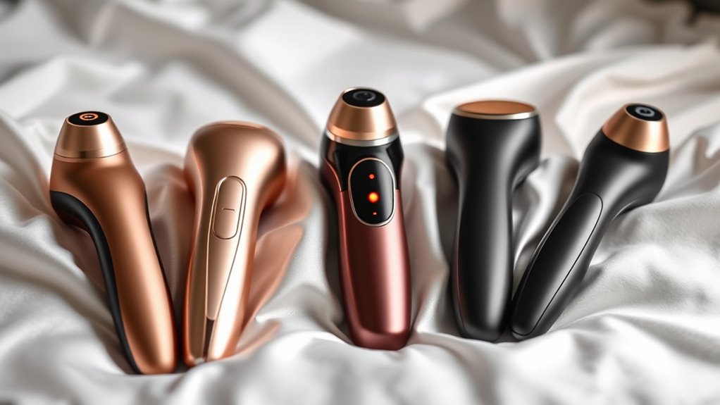 Choosing a facial device that matches your skin type guarantees you get the best results without unwanted side effects. If you have sensitive skin, look for gentle, non-invasive options like LED light therapy or microcurrent devices designed for delicate skin. Oily or acne-prone skin benefits from devices with adjustable intensity levels so you can customize treatments without irritation. Dry or mature skin may require models that offer specific settings or compatibility with nourishing skincare products to enhance hydration and elasticity. Always check that the device’s materials are hypoallergenic and free from irritants. Ensuring compatibility with your skin type helps prevent adverse reactions and maximizes the device’s effectiveness, giving you spa-quality results safely and comfortably at home.
