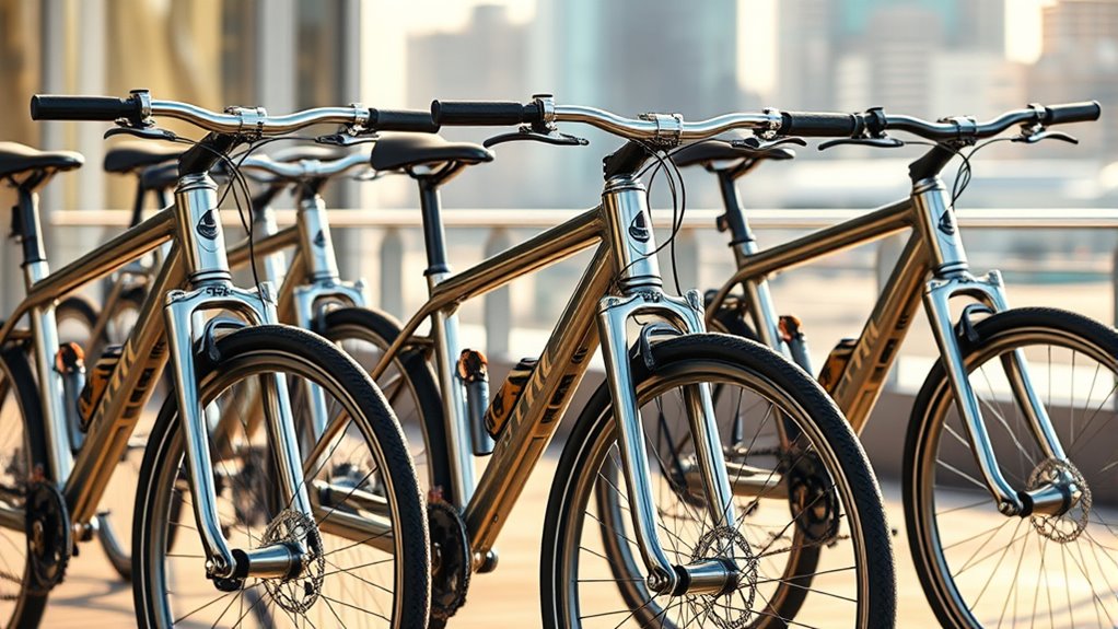 Many premium bikes let you customize luxury features, from high-end saddle options to advanced electronic shifting systems. I love exploring bikes that offer personalized touches like premium grips, custom paint jobs, and integrated tech. These options let you tailor your ride to your style and comfort. So, if you’re seeking a bike that combines performance with luxury, there’s a good chance you’ll find models that offer the customization options you desire.