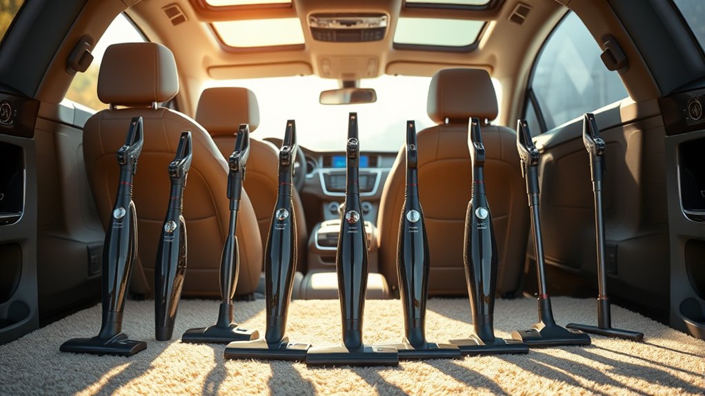 While choosing a premium car vacuum cleaner, understanding suction power levels is essential to ensuring you get the best performance for your cleaning needs. Suction power is usually measured in Pascals (Pa) or air watts (AW), with higher values indicating stronger cleaning ability. I’ve found that many premium models offer multiple suction modes, so you can switch between gentle and deep cleaning based on the mess. For effective car cleaning, look for a vacuum with at least 80 watts or 15,000 Pa of motor power. Remember, consistent suction strength over time relies on quality motors and filters that prevent clogging and maintain airflow efficiency, which ultimately makes cleaning more effective and efficient.