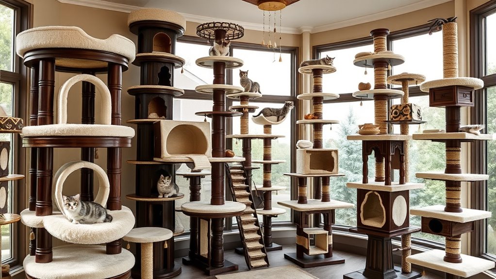 Honestly, these premium cat trees are fantastic for multiple cats. I’ve seen my trio thrive on the spacious platforms and multiple levels, which keep them busy and happy. They’re sturdy, so I don’t worry about stability even with all the jumping and scratching. Plus, the various perches and hideouts give each kitty their own space—it’s like a feline apartment complex, and I love seeing them all enjoy it together!
