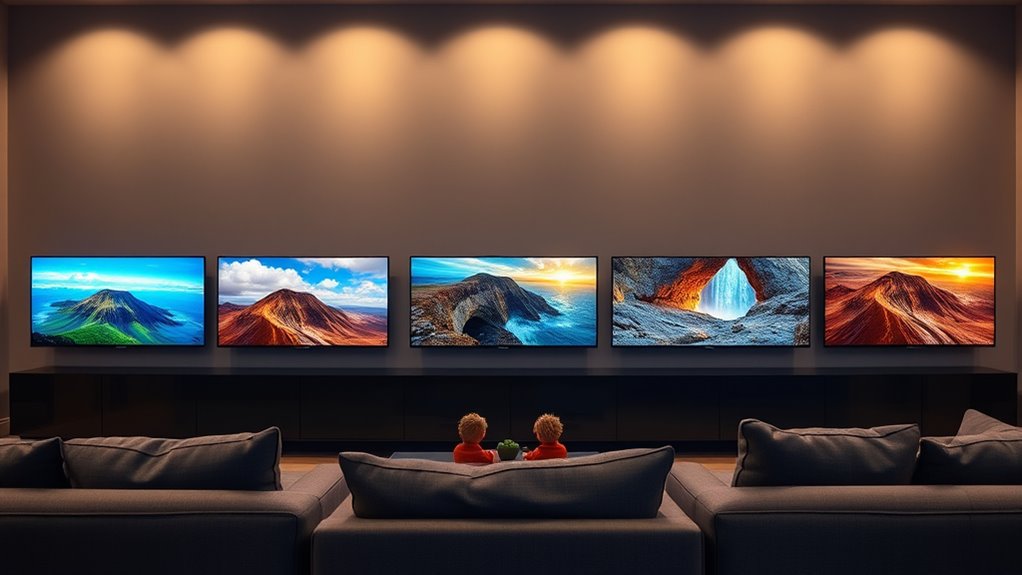 Have you ever wondered how much a higher display resolution can enhance your viewing experience? Upgrading to 4K Ultra HD means four times the pixels of Full HD, resulting in sharper, more detailed images that bring shows and movies to life. Support for HDR formats like Dolby Vision and HDR10+ boosts contrast and color accuracy, making visuals more vibrant and lifelike. The display technology, whether QLED, OLED, or LED, also plays a vital role in color richness, brightness, and black levels, directly impacting picture clarity. Advanced upscaling helps produce clearer images even when streaming lower-resolution content. Plus, a higher refresh rate, such as 120Hz, ensures smooth motion during fast scenes, making sports and gaming more fluid. All these factors combine to deliver a stunning, immersive viewing experience.