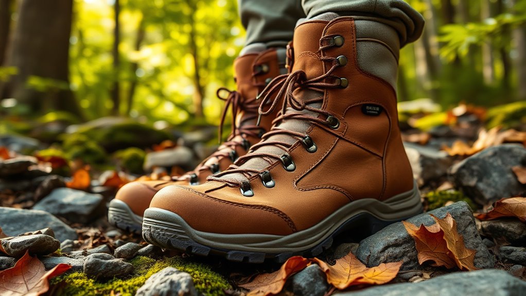 Choosing the right materials is crucial for guaranteeing your hiking boots stand up to tough conditions. High-quality materials like full-grain leather, waterproof-treated leather, or reinforced synthetic fabrics are key to durability, especially on rough terrain and in harsh weather. The outsole, typically rubber with reinforced lugs, provides long-lasting traction and resists wear. Seams and stitching should be reinforced and sealed to prevent water entry and improve longevity. The midsole, made from EVA or polyurethane, needs to be resilient enough to support your feet over extended hikes without breaking down. Proper craftsmanship, including heat-sealed seams and durable hardware, also plays a vital role. These factors combined ensure your boots can withstand the demands of your adventures, lasting season after season.