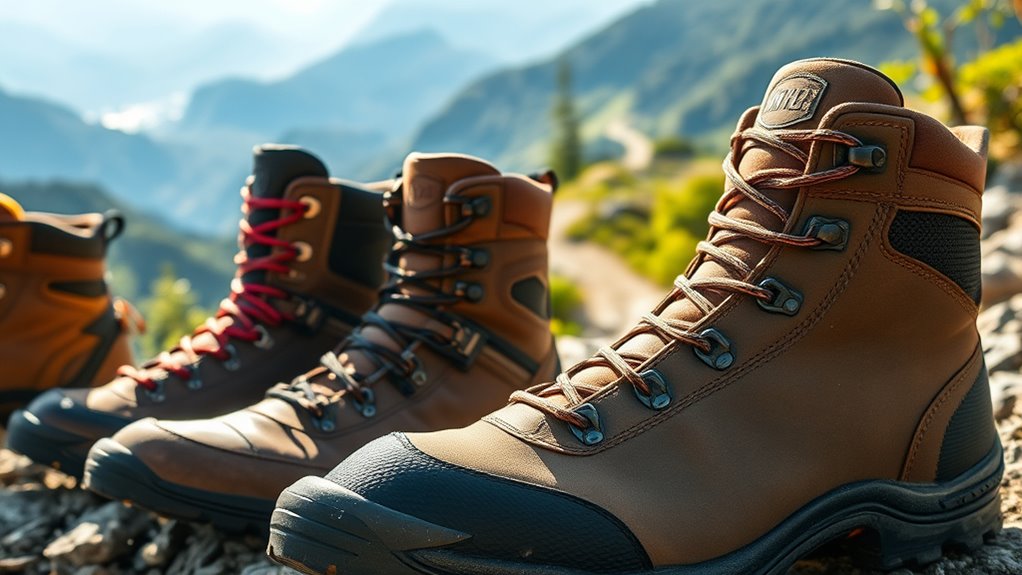 As I navigate rugged trails, I quickly realize how essential ankle support is in preventing injuries and ensuring comfort. I look for hiking boots with an ankle-high shaft that stabilizes my joints on uneven terrain. Properly designed ankle support features padding and reinforced materials, which help prevent sprains and reduce fatigue during long hikes. I appreciate a collar height that allows full range of motion while still offering that necessary stabilization. An adjustable lacing system is vital, too; it secures my ankle snugly and keeps my heel from slipping. Some boots even incorporate molded or contoured supports, providing extra stability without sacrificing comfort. It’s all about finding that perfect balance for my adventures.