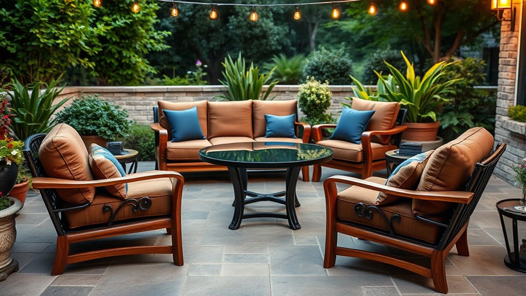 When evaluating premium patio furniture, weather resistance plays a key role in guaranteeing long-lasting durability outdoors. I look for pieces made from weather-resistant materials like PE resin wicker, powder-coated steel frames, or synthetic resin, which can handle sun, rain, and humidity without deteriorating. Cushions with water-repellent, fade-resistant, and removable covers are essential for maintaining comfort and easy upkeep. All-weather construction often includes rust-proof joints, UV-resistant coatings, and waterproof wicker to prevent corrosion and fading over time. Proper maintenance, such as covering furniture during heavy rain or storing cushions indoors, markedly extends lifespan. Ultimately, furniture that resists cracking, warping, and corrosion ensures I enjoy my outdoor space without constantly worrying about damage from the elements.