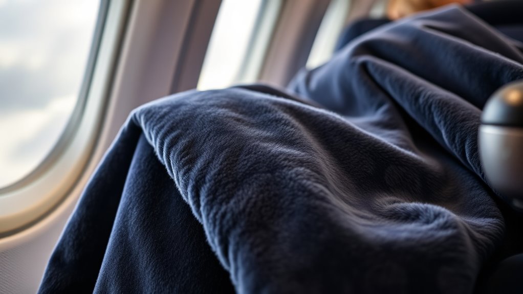Premium travel blankets differ from standard ones mainly in quality and features. I find they’re made with softer, more luxurious fabrics like cashmere or high-grade fleece, which feel better against my skin. They’re often lighter, more compact, and durable, making them perfect for travel. Plus, premium blankets usually have better insulation, so I stay cozy longer without adding bulk. Overall, they elevate my travel comfort considerably.
