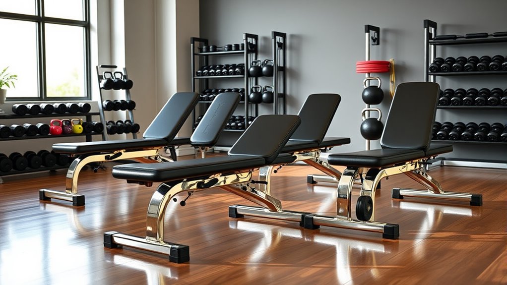 When choosing a premium weight bench, I focus on key factors like adjustability, durability, and weight capacity to guarantee it meets my training needs. I also consider space-saving designs and comfort features like padding for a better workout experience. These points help me find a bench that’s safe, versatile, and fits well into my space.