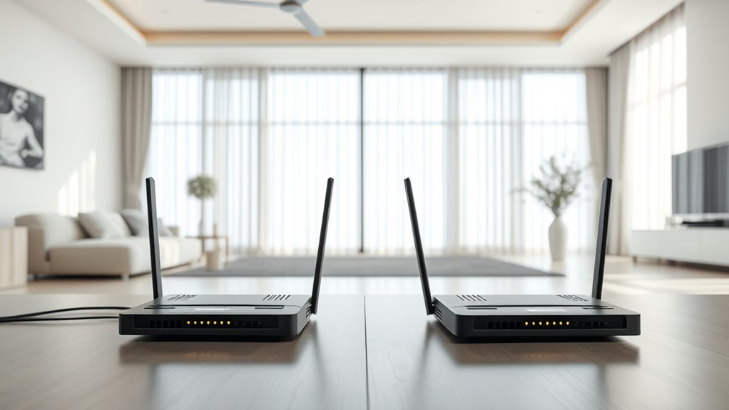 Mesh Wi-Fi systems excel in multi-story homes by providing strong, consistent coverage across all levels. I’ve found that they eliminate dead zones and reduce Wi-Fi drops, even upstairs or in basement corners. The nodes work together seamlessly, creating a unified network that handles multiple devices effortlessly. If you have a multi-story house, I definitely recommend a mesh system to guarantee reliable connectivity everywhere without hassle.