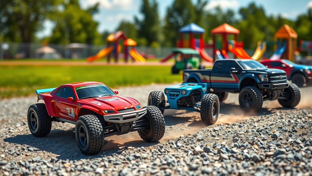 Imagine a colorful, sturdy RC car zipping smoothly across the lawn—that’s perfect for beginners and kids. I recommend models with simple controls, durable bodies, and moderate speeds, like the Traxxas Slash Jr. or the Mini Q Stealth. These cars are easy to handle, forgiving if they bump into things, and built to last. They make learning fun and safe, turning every race into a joyful adventure.